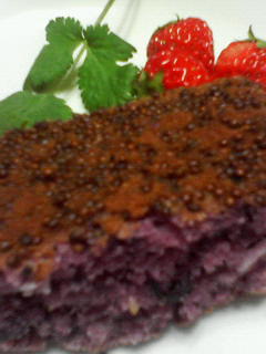 ↑底の部分。香ばしい「つぶつぶ」♪ 底に敷いたエゴマが、すごく美味しい綺麗色のケーキです。エゴマが無い場合は、胡麻で作ってみて下さい。荒く潰した紫芋のお芋っぽさも美味しいですし、ココナッツの香りが幸せ気分にしてくれます。