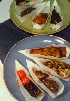 この週末、久しぶりに、ダーリンと、行きつけのフレンチレストランに行きました。地元のカキを使った料理が有名なお店で、様々な味をつけた、焼きカキ「オイスターヴァリエ」が食べられます。 一つの素材を、様々な味をつけ、焼き、一皿に盛る料理…とっても贅沢ですよね…。いつも幸せな気持ちになります。色んな海の幸で、こんな風な料理を作ってみたい…。 2月まで、ぶりの旬と言われます。カキは食べたばかりなので、今回、旬のブリを使ってみました。 上のフレンチレストランに倣って、8種類の味が楽しめる、バリエーション料理…レストランと違って、フランス料理ではなく、気軽に和風で演出してみました。 ブリは照り焼きや、味噌漬、ブリ大根…あまり変化の無い食材のようですが、小さな紙で小船を作って、一つずつ、違う味のタレを入れ、バラエティー豊かに演出してみました。 材料;ブリ、片栗粉、酒、和からし、酢、味噌、ししとう、みりん、柚子胡椒、砂糖、ごま油、しめじ、ゆかり、マヨネーズ、醤油、生姜、卵黄、佃煮昆布、胡麻、唐辛子粉、山椒、梅干、ねぎ、プチトマト ①焼きタレ8種類を作る。各組み合わせは、次の通り。基本的には混ぜ合わせるだけで、出来ます。 A.和からし、酢、味噌、ししとう(種を取り、細かく切る) B.柚子胡椒、砂糖、ごま油、みりん、しめじ(石づきを取っ て、ほぐしたもの) C.ゆかり、しょうゆ、マヨネーズ D.すりおろした生姜、味噌、卵黄 E.すり胡麻、酢、しょうゆ、みりん、唐辛子粉 F.山椒、醤油、みりん D.梅干(梅肉をすり潰して使う)、ネギ(小口切り)、しょう ゆ、ごま油 E.佃煮昆布、ごま油、酢、飾りにプチトマト ②オーブンペーパーで船形を折る ③ブリの骨を除き、一口大に切る。酒で洗い、片栗粉をまぶす。 ④ブリを②に入れ、上から、それぞれA~Eの焼きタレを流し込む。 ⑤180度に暖めたオーブンで20~25分焼きます。 この味付けを考える時に、和食って豊かだなぁ~と思いました。こんなに種類多く、楽しめるとは…全く思っていませんでした。ご飯にも、お酒のおつまみにも、お好きな味が見つかりますね。 ↓応援ぽち、よろしくお願いします。とても励みになります。 PR