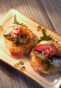 03/15/13:08 きな粉みそ焼おにぎりのカナッペ♪オイルサーディンをトッピングこんにちは。はるちゃんです♪