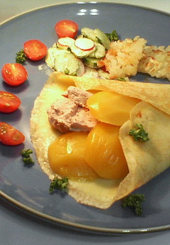 今朝、私は早起きしたのですが、ダーリンが寝坊したので、いっしょに朝ご飯を食べ損なってしまいました…。おかげで、お腹がぺこぺこ、食べる気マンマン!ブランチにクレープを焼いてしまいました。 ちょっと遊びココロで、豆乳とお米の粉で焼きました。お米の粉…手軽な上、もち米の粉もブレンドされてるお団子用の粉を使っています。お米の粉の生地だから…生春巻きのイメージで、ちょっと食感の違う、美味しい生地が焼けました~♪やや、しっかりしているので、食事用には、米粉クレープって…ピッタリかな~ってちょっとした発見! 爽やかなフルーツも食べたくって、マンゴーとカナールのムースを合わせました。カナールのムースは、鴨のレバー、鶏のレバー、鴨の脂肪、ワイン等で作られてます。マンゴーに合いますね。 ↑ 「クリックご協力お願いします。 ランキングサイトの順位が上がって、読んでくださる方が増えます♪」 ・レシピ (*^-^*)Ψ (*^-^*)Ψ 材料;玉子1個、コーンスターチ スプーン2杯、米粉(もち米入りだんご粉) スプーン2杯、豆乳50cc、砂糖、マンゴーやカナール等のトッピング、はちみつ等 ※玉子の大きさなどが影響して来ますので、粉や豆乳の配合は、僅かな生地で、試し焼きされて、調整されて下さい。 ①コーンスターチ、米粉、溶き玉子、砂糖を合わせる。 ②薄く油をひいたフライパンに、生地を流し入れて、強火で片面を焼く。(焦がさないように) ③表面が乾いたら、焼けているので、フライパンから取り出す。多少、生っぽくても余熱で火が入ります。 ④お好みの具といっしょに盛り付けます。 ⑤好みではちみつ、メープルシロップをかけます。 最後まで読んで下さって、ありがとございます~♪ PR