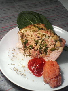 01/28/10:27 焼きクスクス★エキゾチックな料理を、鶏胸肉と豚肉を使って…こんにちは。はるちゃんです♪ 近年、エキゾティックな食材が手に入るようになり、その調理法の情報が求められる時代だと感じています。 クスクスも、そういった食材の一つのようで、先々週「鮭のクスクスサラダ」を載せたところ、どのような食べ物なのか聞かれる事がありました。フランス料理では、サラダに使われる事が多いらしく、著名なパトリスジュリアン氏の、カフェの本で紹介された事もあります。 味は、とても淡白で、あっさりしてツブツブの、かなり固く乾燥したインスタントヌードルのようなイメージです。上手い例え方があれば良いのですが…。一度使って頂くと、凄く良く分かりますし、様々にアレンジ可能で、たいへん面白い食材だと思います。特徴的な味ではないので、何にでも合わせられる柔軟性が魅力です。 ☆焼きクスクス★エキゾチックな料理を、鶏胸肉と豚肉を使って… 材料;クスクスカップ1、かつお菜(小松菜も可能、繊維質のある野菜が良い)、玉子1個、豚の切り落とし300g、鶏胸肉2枚、塩こしょう、ガーリック、好みのハーブ(タイム、オレガノ、ローズマリー、セージなど) ①鶏胸肉は3枚に観音開きのように開き、筋切りをして叩いて伸ばしておく。豚肉は細かく刻んでおく。(ひき肉にはしないで下さい。後でクスクスと混ぜた時に、お互いの食感が無くなってしまいます。食感を残す程度に刻んで下さい) ②クスクスを1.5倍の熱湯で戻す。少し芯が残るようにし、戻しすぎない。(肉類と合わせて焼いた時に、肉汁を吸わせるため) ③かつお菜を細かく刻んで②のクスクスに混ぜる。塩こしょうした豚肉も同様に混ぜ込んで、軽く捏ねておく。捏ねすぎないよう、クスクスの粒を残す。ハーブと玉子を加え、ひとまとまりになる程度にする。 ④オーブンペーパーに、鶏胸肉を重ねて広げ、1枚のようにする。その上に③の捏ねた材料を乗せる。半量ほど乗せたら、オーブンペーパーの端を持って、崩さないように金属製の型に入れる。残りの③を上から入れて、空気を抜きながら、しっかり押えて形を整える。断面的には、とり胸肉が凹の形になり、窪んだ部分に③が入っているような状態。 ⑤200度のオーブンで40分焼く。 ⑥冷め、落ち着いてからカットして盛り付ける。 今回、ソースは作りませんでした。ケチャップ・オリーブオイルがすごく合う料理です。マスタードを効かせたマヨネーズも良いです。豚肉とクスクスの食感の落差や、野菜の彩り、鶏肉のジューシィーさが美味しさの秘訣。 こんな、少し変わったクスクスの食べ方はいかがでしょう?