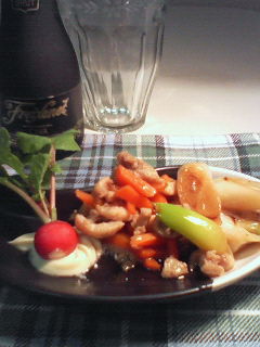 01/14/20:50 下仁田ネギと合鴨の皮のマリネこんばんは。はるちゃんです♪ 冬の美味しい野菜「下仁田ネギ」と、「合鴨の皮」。どちらもマリネに合います。 今夜は一緒にマリネにしてみました。 ごま油で香ばしく、じっくり焼いた下仁田ネギの甘味が程よい一品です。 少し置いて、味を馴染ませたほうが美味しいので、前もって作っておくと良いです。 ☆下仁田ネギと合鴨の皮のマリネ 材料;下仁田ネギ、合鴨の皮、人参、なます酢(もしくは甘酢)、醤油、ごま油、一味 ①合鴨の皮と人参は千切りにして、さっと茹でる。余りにも脂身の多い物の場合は長めに茹で、油を抜く。 ②下仁田ネギは5センチに切り、ごま油を引いたフライパンで焼き目をつけ、火を通す。 ③なます酢、醤油を合わせ、①&②を熱いうちにつける。冷める時に味が馴染む。一味を振っても。 ※このレシピは鶏皮でも作れます…鶏皮のマリネ(酢漬)は九州のお惣菜屋さん、お肉屋さんで昔からよく売られているようです。細かーい千切り状に切った鶏皮を醤油風味のマリネにしたもの。どうやって作るのかは…九州人ではない私には、正確には分からないけれど、お酒やご飯に合うおかずです。